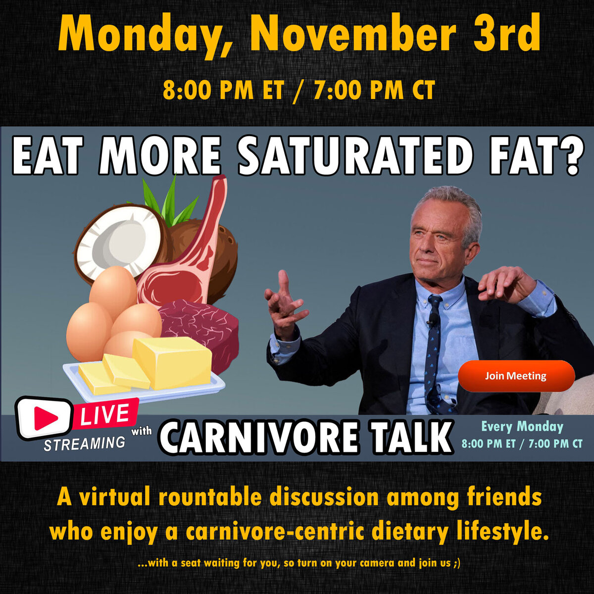 WHAT DO YOU THINK? Join us either ON SCREEN as our guest or in the CHAT tonight as we discuss saturated fats on the carnivore diet.