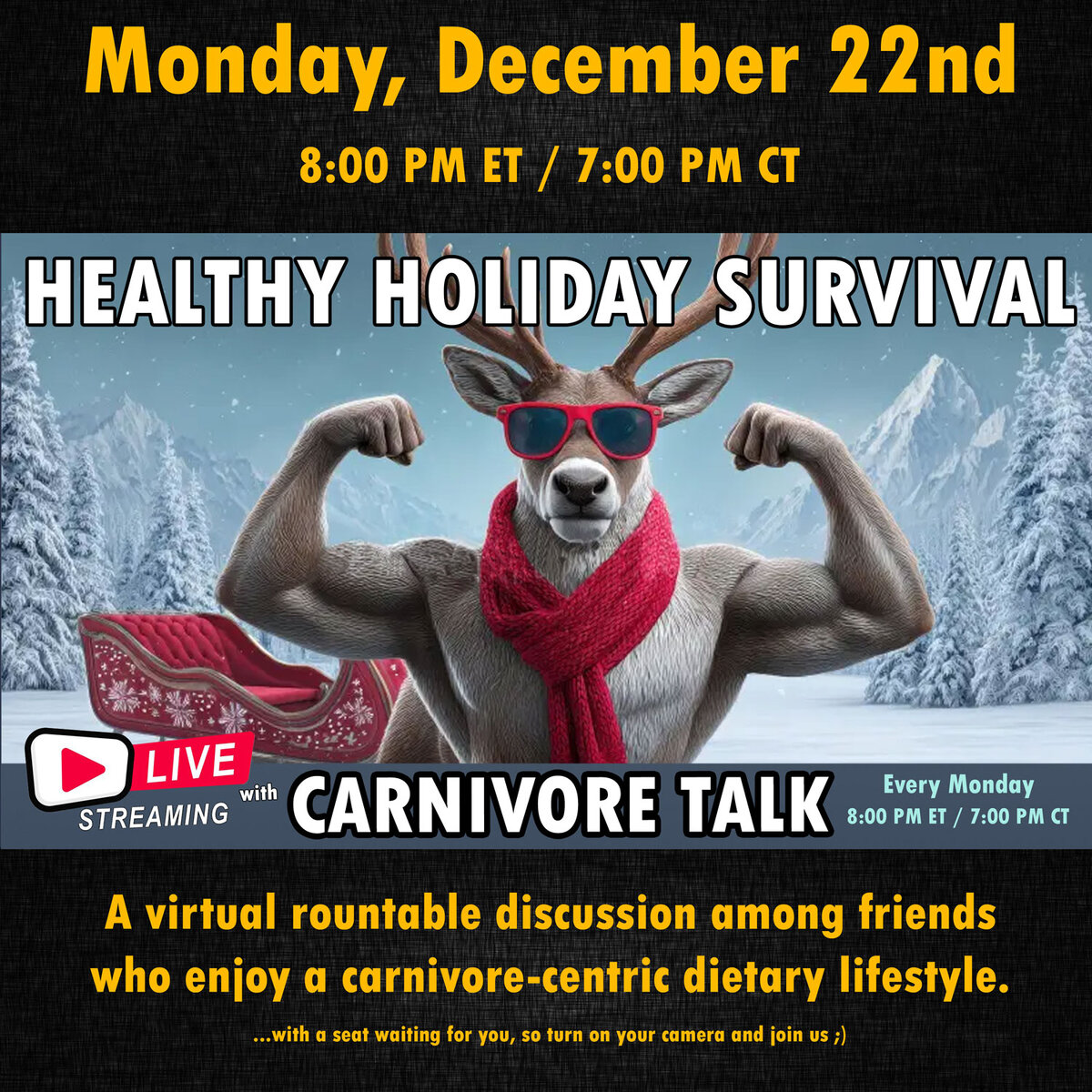 Family peer pressure can be the worst, especially during the holidays when you only want to stay on plan and not let Christmas dinner derail your diet. If you want to avoid looking like Santa, then skip the cookies. Join us on screen as our guest on tonights Open Mic Night as we discuss strategies for navigating the holidays, family, and well-meaning friends while on a carnivore or keto diet.