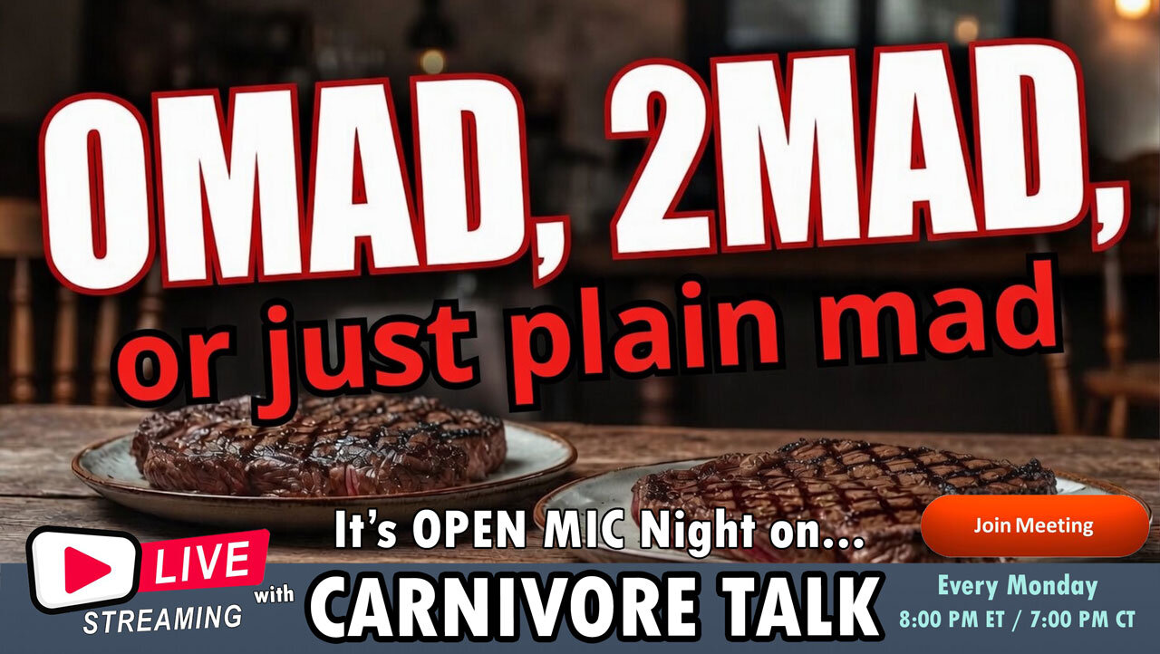 OMAD, 2MAD, or Just Plain MAD? Intermittent Fasting on a Keto or Carnivore Diet 🎙️ In this episode of Carnivore Talk, we dive deep into the powerful combo of One Meal a Day (OMAD), Two Meals a Day (2MAD), or sticking with more frequent meals - all while eating keto or carnivore. Discover how extending your fasting window can supercharge your results: deeper ketosis, faster fat loss, improved insulin sensitivity, boosted autophagy for cellular repair, rock-steady energy and mental clarity, reduced inflammation, better gut rest, and even hormonal balance. We break down the real advantages of OMAD vs. 2MAD on a meat-based diet, share practical tips for making it sustainable, and discuss when one approach might beat the other. Whether you're looking to break a plateau, simplify your life, or take your health to the next level, this conversation has you covered. If you're already carnivore or keto, adding strategic fasting might be the missing piece. Hear the science, real-world benefits, and listener-style stories that make this lifestyle so transformative. Drop your questions or experiences in the comments — what's your go-to: OMAD, 2MAD, or something else? Or JOIN US ON SCREEN as our surprise guest with your own device.