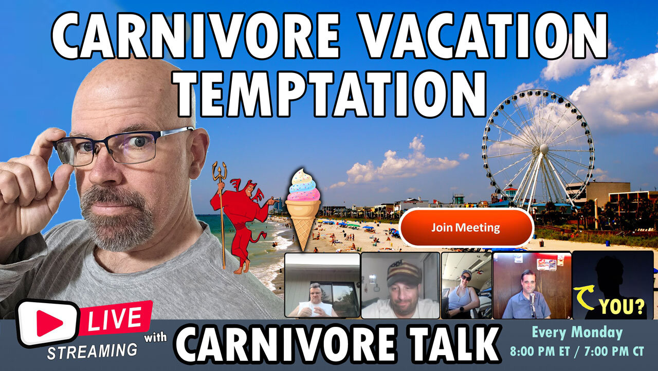 We're back from Myrtle Beach, South Carolina. How did I manage the week on my carnivore diet in the face of temptation and surrounded by family members who prefer to eat anything and everything? Did I gain weight? JOIN US ONSCREEN with YOUR camera on tonight's carnivore roundtable discussion, and tell us what you do to survive a holiday with the family. Do you stay faithful, or do you treat it as a special occasion?